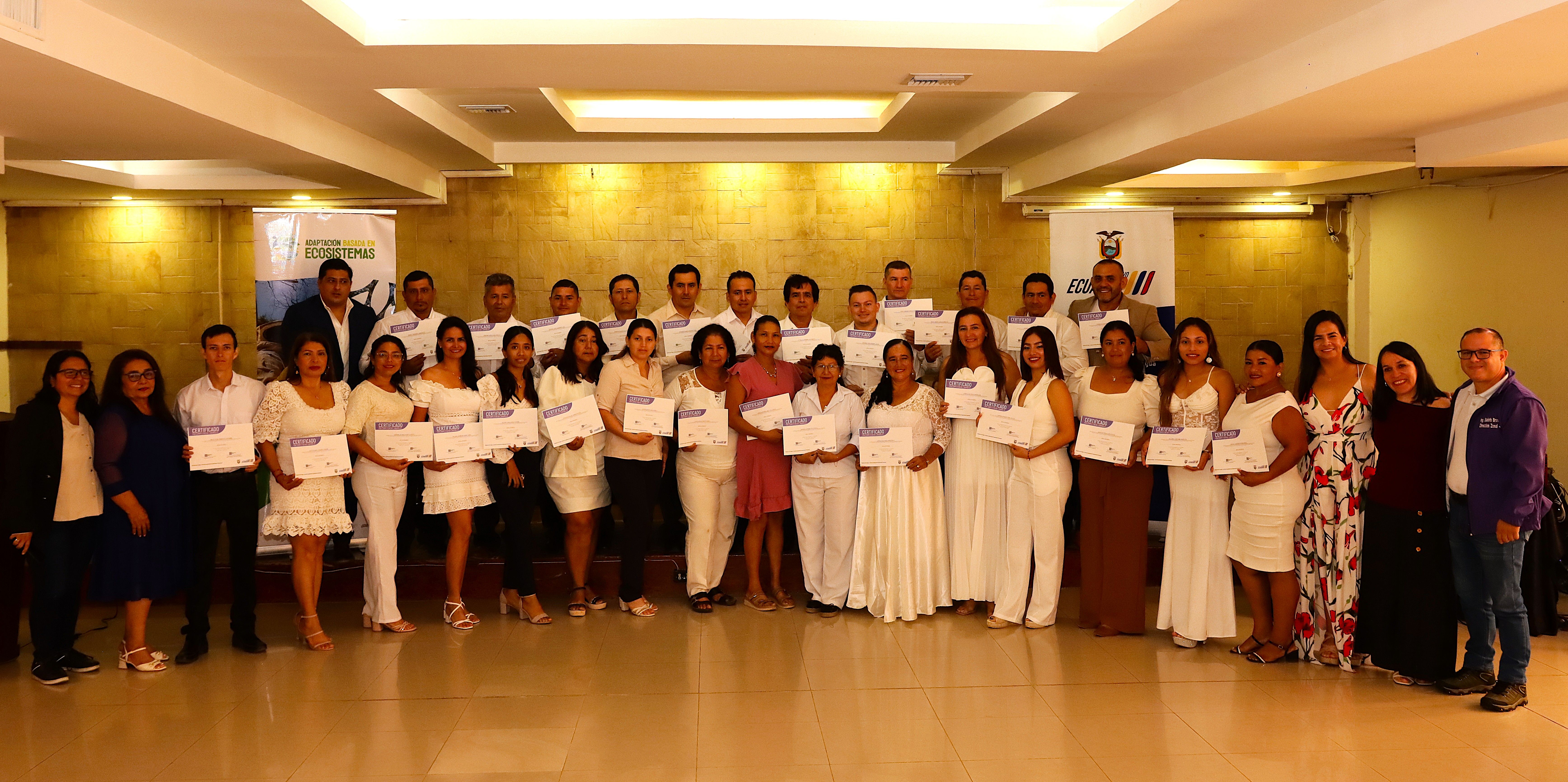 Un total de 30 personas (17 mujeres y 13 hombres) de la provincia de Manabí, beneficiarias del Programa EbA LAC, obtuvieron el título de “Apicultor Básico” tras culminar con éxito las capacitaciones teóricas y prácticas desarrolladas en el marco de la medida de Adaptación al cambio climático basada en Ecosistemas (ACC-AbE) de Apicultura.