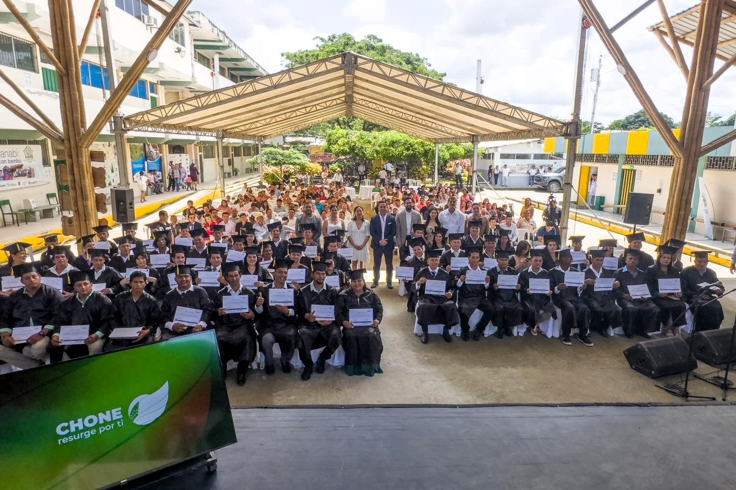 Estas 16 mujeres pioneras son parte de las 67 personas que se incorporaron como nuevas especialistas al graduarse en la primera Escuela Taller en Construcciones Sostenibles con Bambú (ETCSB) en Chone, Manabí.